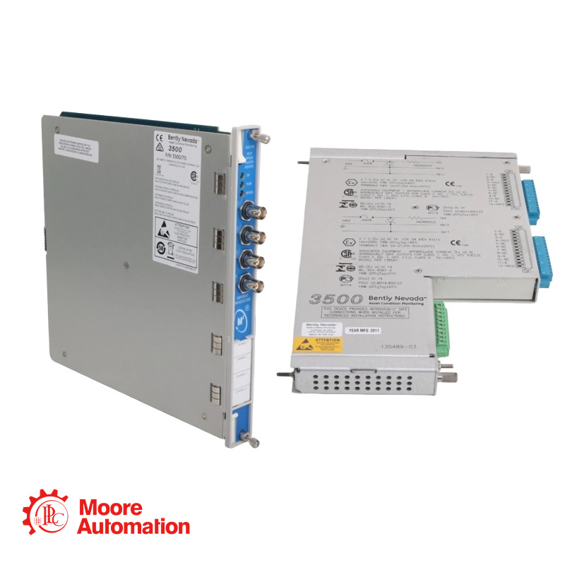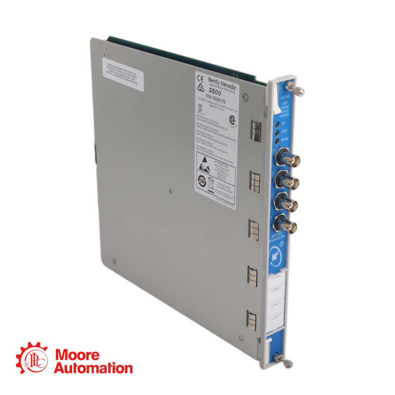 The Bently Nevada 3500/70M Recip Impulse Velocity Monitor is a 4-channel device used as part of the reciprocating compressor solutions package to monitor compressor crankcase and crosshead vibration. The monitor accepts input from seismic transducers, conditions the signal to derive vibration measurements, and compares the conditioned signals with user-programmable alarms.