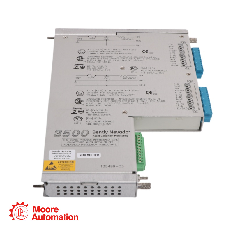 A: It is a 4‑channel monitor for reciprocating compressors. It measures crankcase and crosshead vibration using seismic transducers. The 135489-03 I/O module provides internal intrinsic safety barriers and internal terminations for up to four Proximitor or accelerometer sensors.