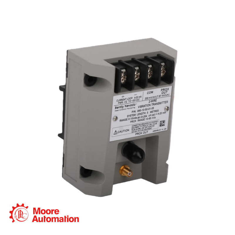 The 990-05-70-01-CN transmitter is a two-wire, loop-powered device that accepts input from our 3300 NSv proximity probe and its matching extension cable (available in 5 m and 7 m system length options). The 990 Vibration Transmitter is intended primarily for the original equipment manufacturers (OEMs) of centrifugal air compressors or small pumps, motors, or fans who prefer to provide a simple 4 to 20 mA proportional vibration signal as the input to their machinery control system.